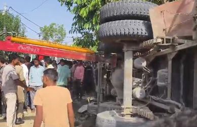 The accident took place in the Chhibramau area, where the truck created panic after losing control on the road. According to officials, the vehicle first rammed into a motorcycle and a scooter before ploughing into a line of shops and overturning.