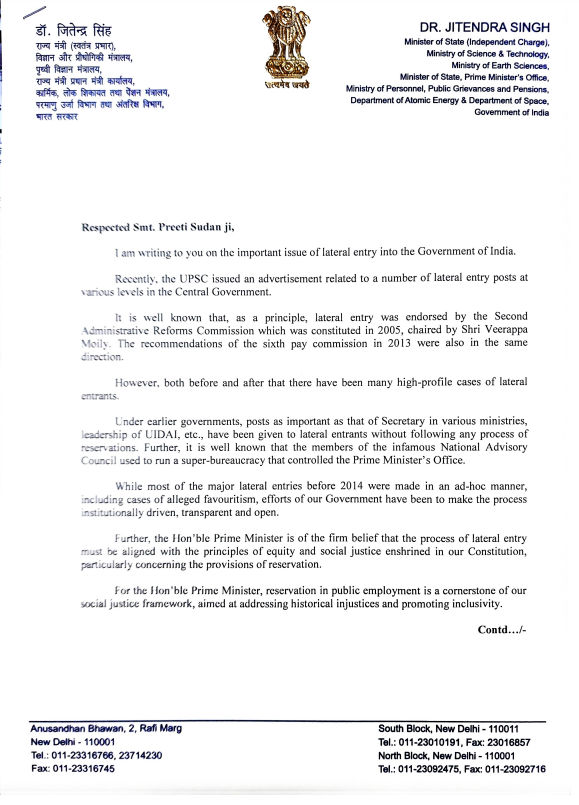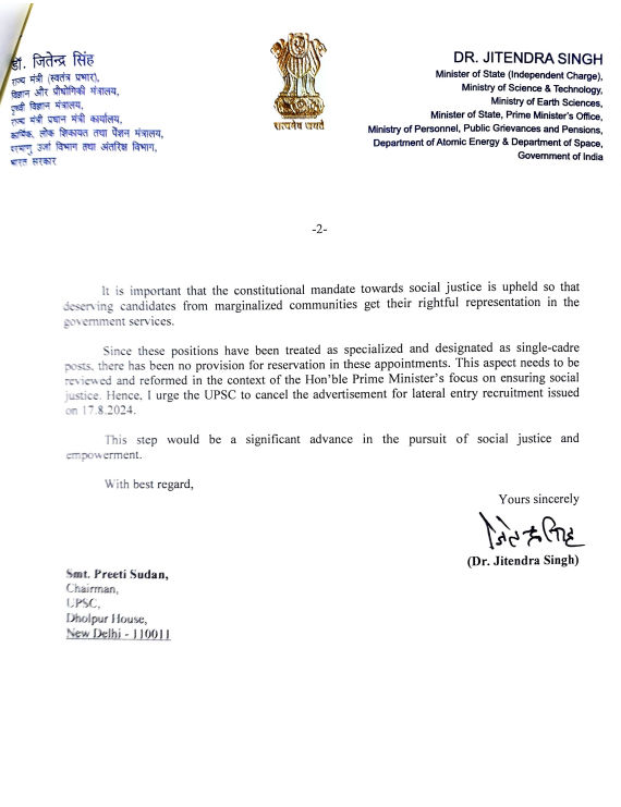 “The Hon’ble Prime Minister is of the firm belief that the process of lateral entry must be aligned with the principles of equity and social justice enshrined in our Constitution, particularly concerning the provisions of reservation,” read the letter.
