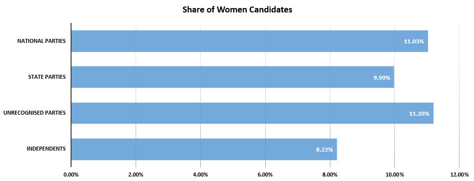In state assembly elections, the report found that 4,295 out of 43,348 candidates (10%) were women, and 1,698 seats (41%) did not have a single female candidate.