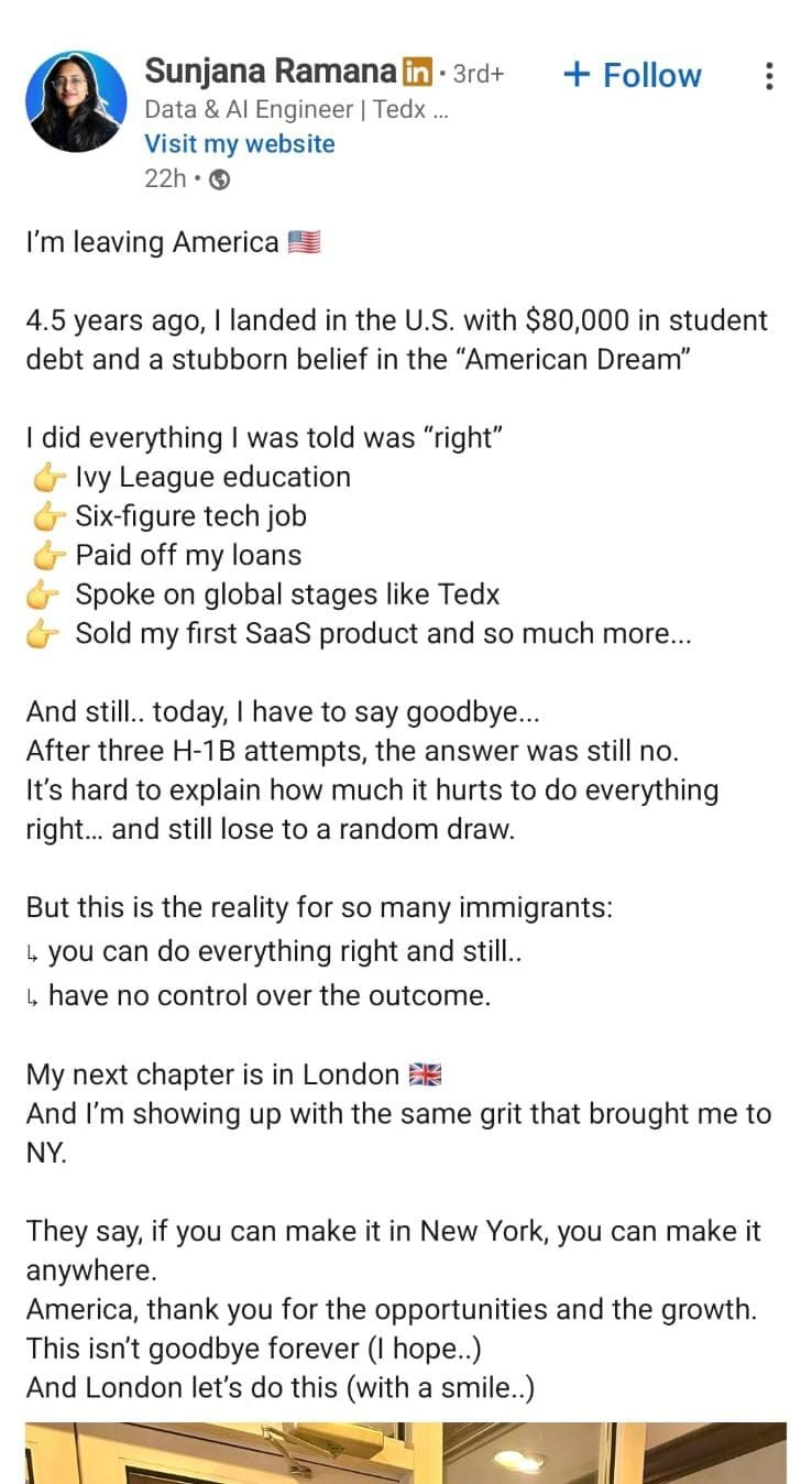 In a LinkedIn post explaining her choice, she described how the lottery’s reliance on chance, rather than merit or experience, left her with no viable route to continue working in the U.S. “After three H-1B attempts, the answer was still no,” she wrote, adding that she had done “everything right” yet was thwarted by a system beyond her control.