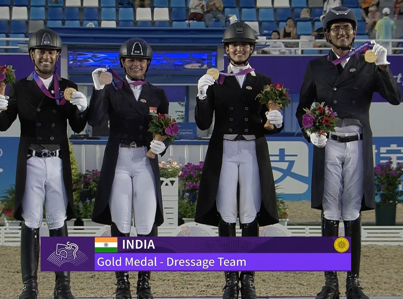 Indian equestrian team, consisting of Sudipti Hajela, Hriday Vipul Chheda, Anush Agarwalla, and Divyakriti Singh, clinched a gold in the horseriding Team Dressage event.