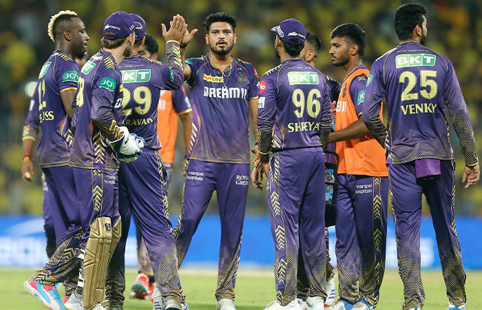 Philip Salt (wk), Shreyas Iyer (c), Sunil Narine, Angkrish Raghuvanshi, Venkatesh Iyer, Ramandeep Singh, Rinku Singh, Andre Russell, Anukul Roy, Mitchell Starc, Vaibhav Arora, Varun Chakaravarthy, Suyash Sharma, Manish Pandey, Rahmanullah Gurbaz, Sakib Hussain, Harshit Rana, Dushmantha Chameera, Srikar Bharat, Nitish Rana, Chetan Sakariya, Sherfane Rutherford, and Allah Ghazanfar