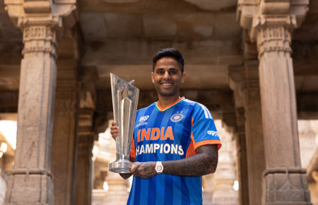 India captain Suryakumar Yadav visited the historic Adalaj Ni Vav on Monday, where he posed with the ICC Men's T20 World Cup 2026 trophy following India’s title-winning campaign.